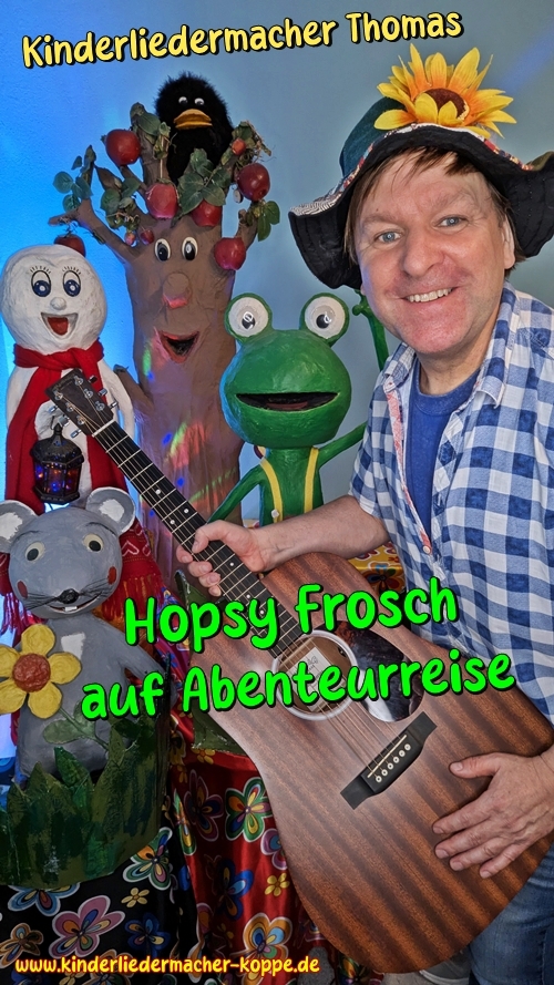 Das lustige Kinderlieder-Mitmach-Programm "Hopsy Frosch auf Abenteurreise" handelt von Freundschaft, Natur und Umwelt, von Abenteuern und Lebensfreude von Kinderliedermacher Thomas Koppe.